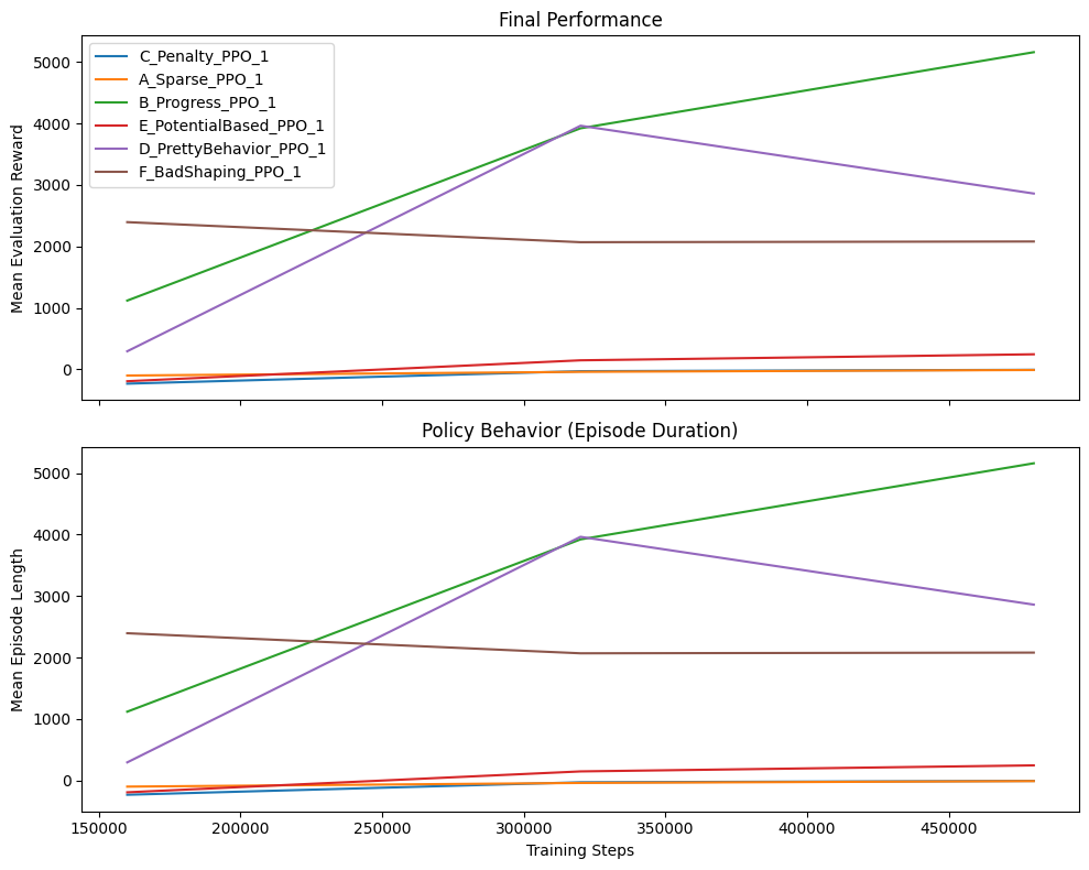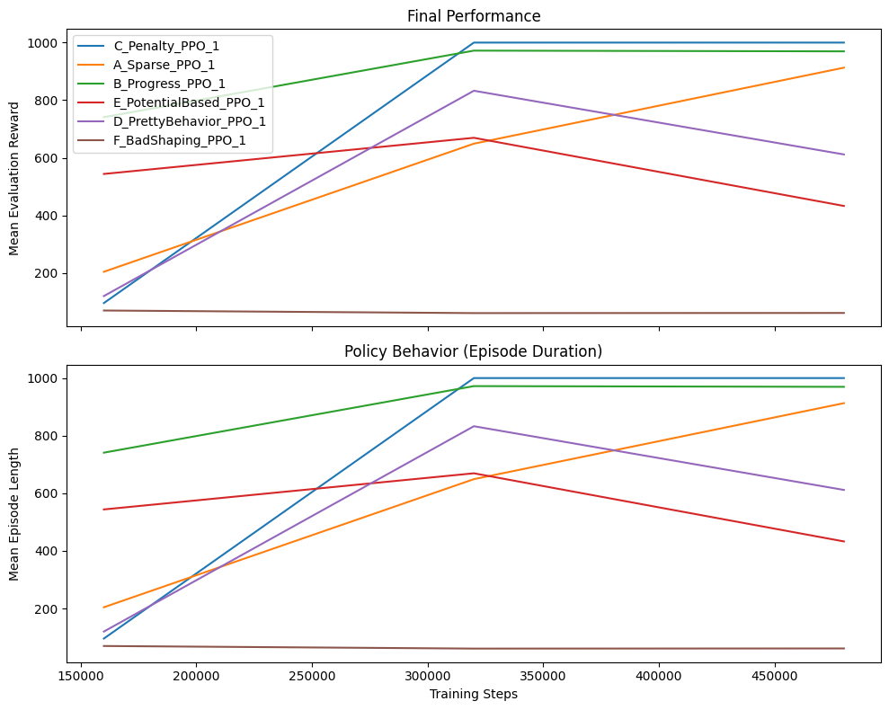 - Exploration Suppression via Dense Guidance: “Progress” and “BadShaping” succeeded partly by reducing the exploration state space—the agent was so strongly guided toward intermediate rewards that it found a high-reward behavior quickly. However, this can create local optima; “PrettyBehavior” collapsed because its shaped rewards likely led the policy into a locally optimal but globally poor behavior from which PPO’s clipped updates couldn’t escape.