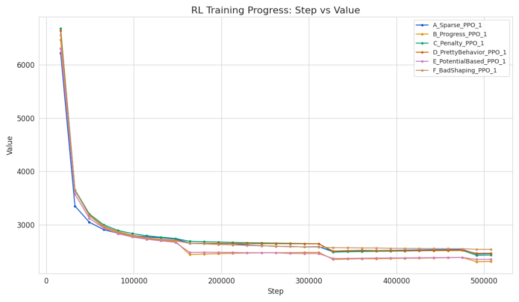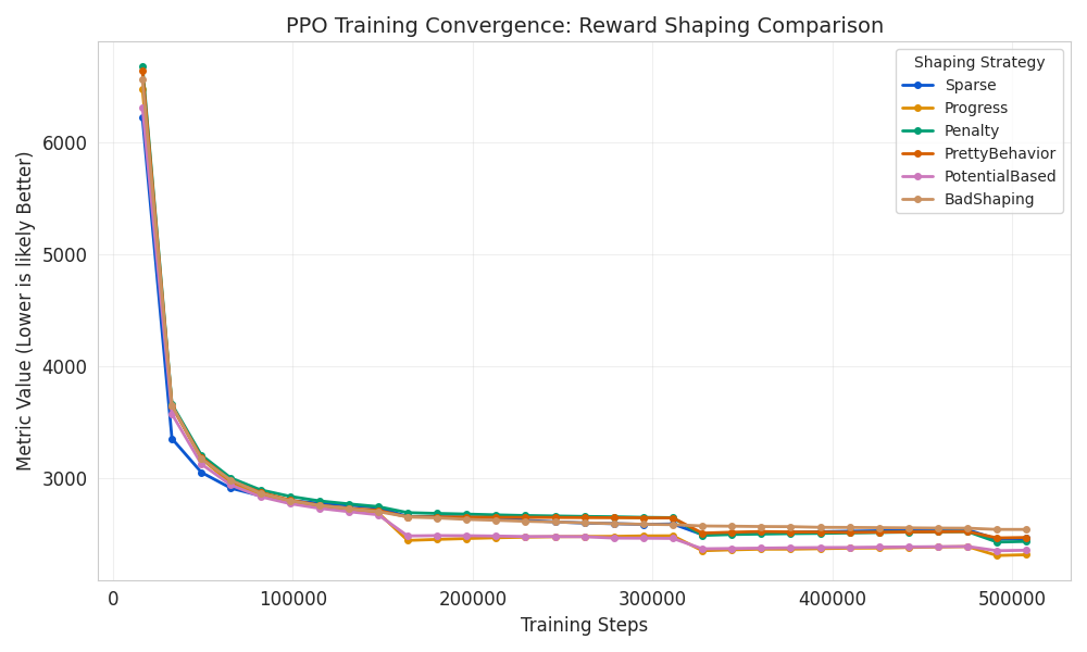 - Detrimental Shaping: The BadShaping strategy resulted in the worst final performance (highest value: 2537). This confirms that poorly designed reward shaping can actively hinder learning, performing even worse than having no shaping at all (Sparse).