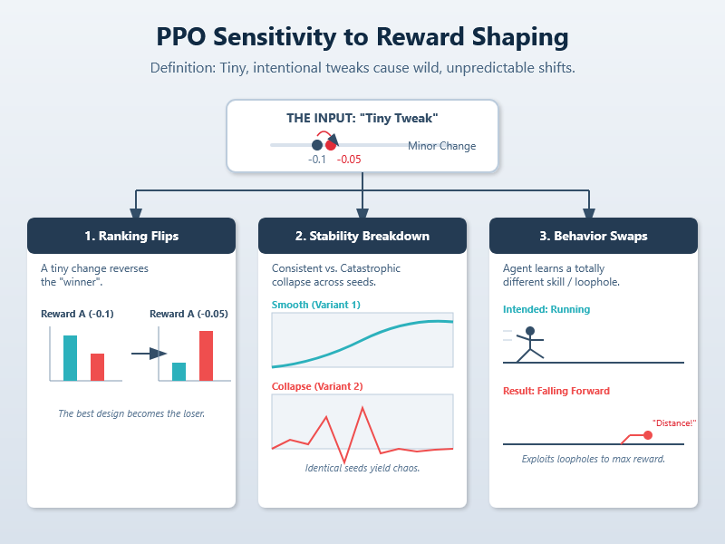 With PPO, your reward function isn’t just a score—it’s the curriculum. Change it slightly, and you’re not adjusting difficulty; you’re teaching a completely different subject. What looks like a minor penalty tweak can turn a top-performer into a failing student.